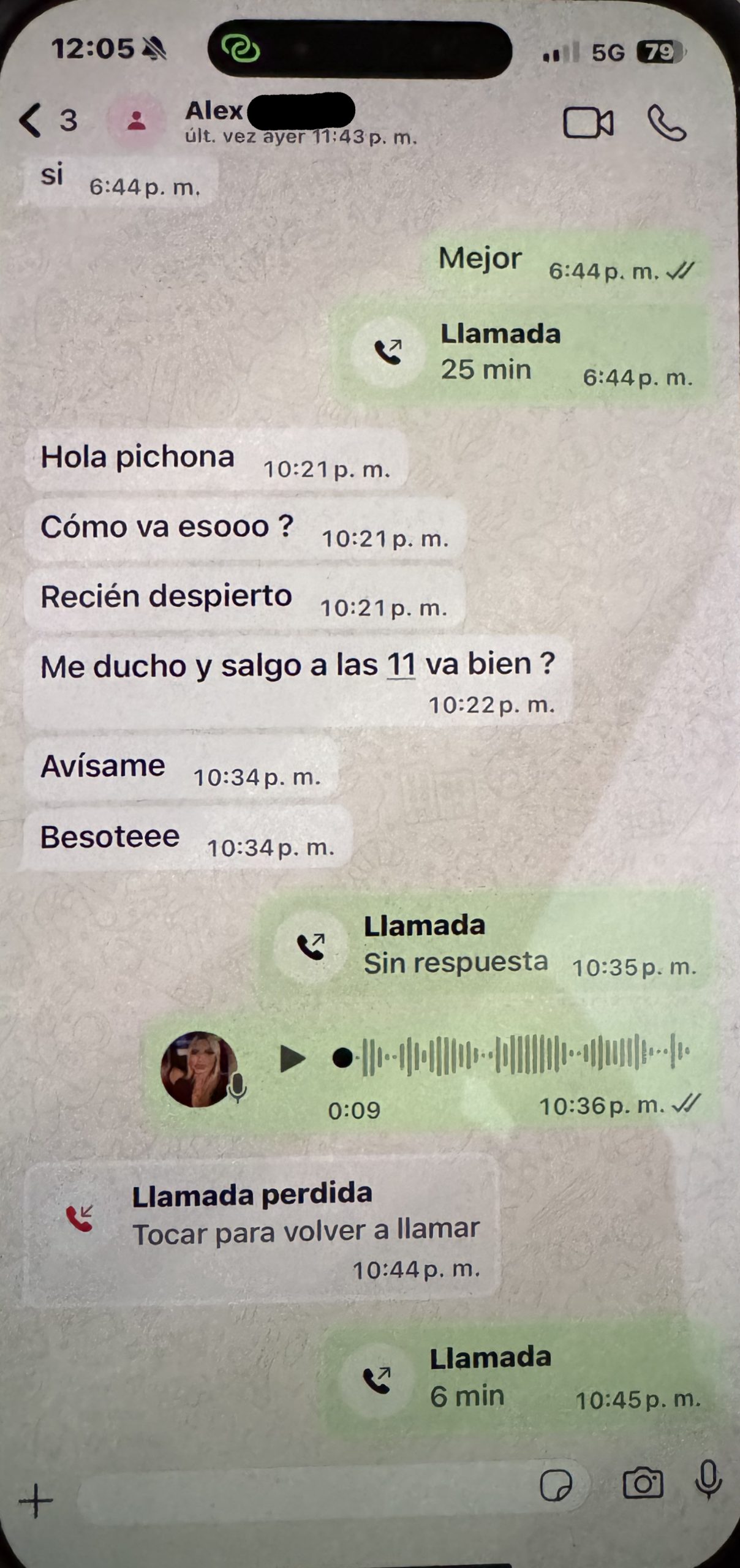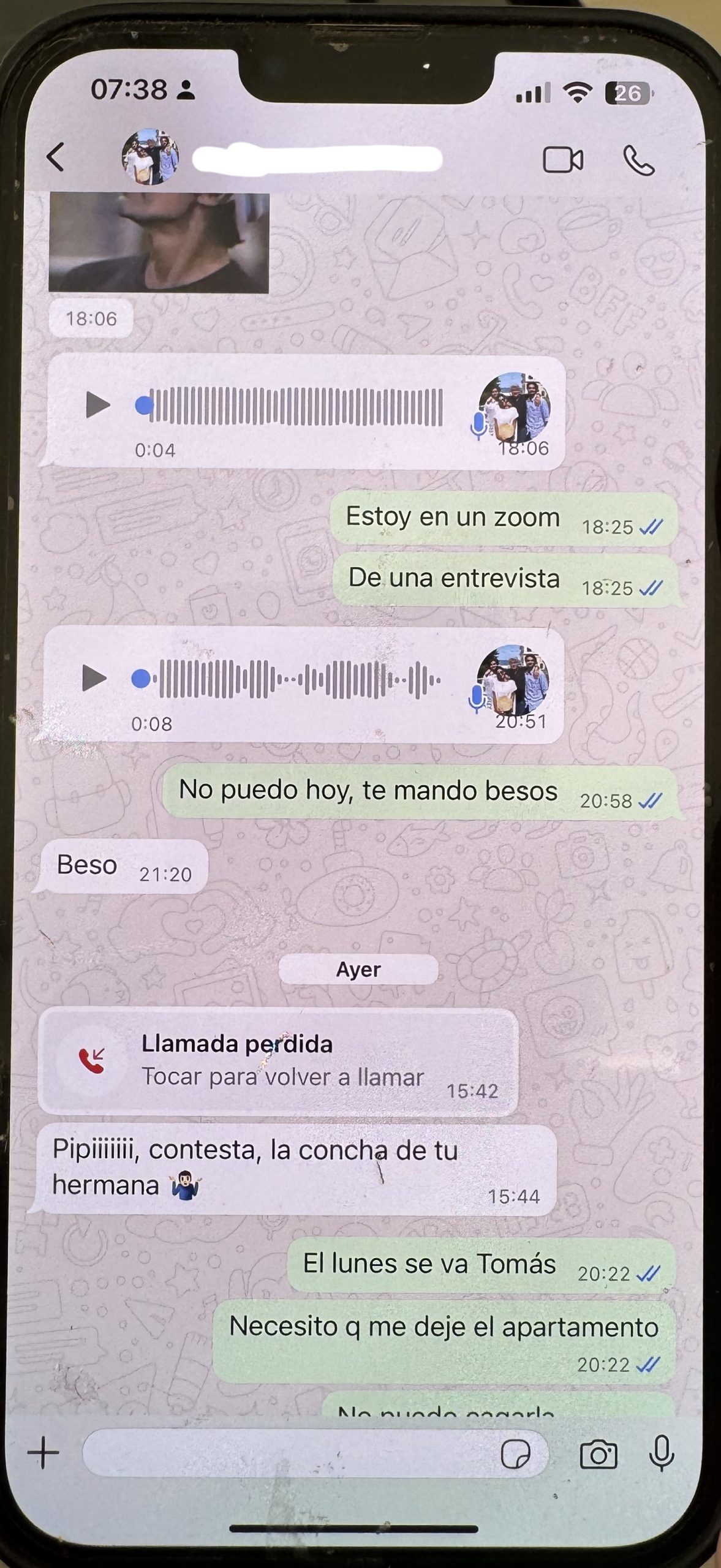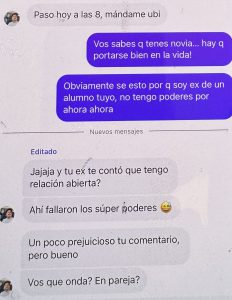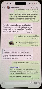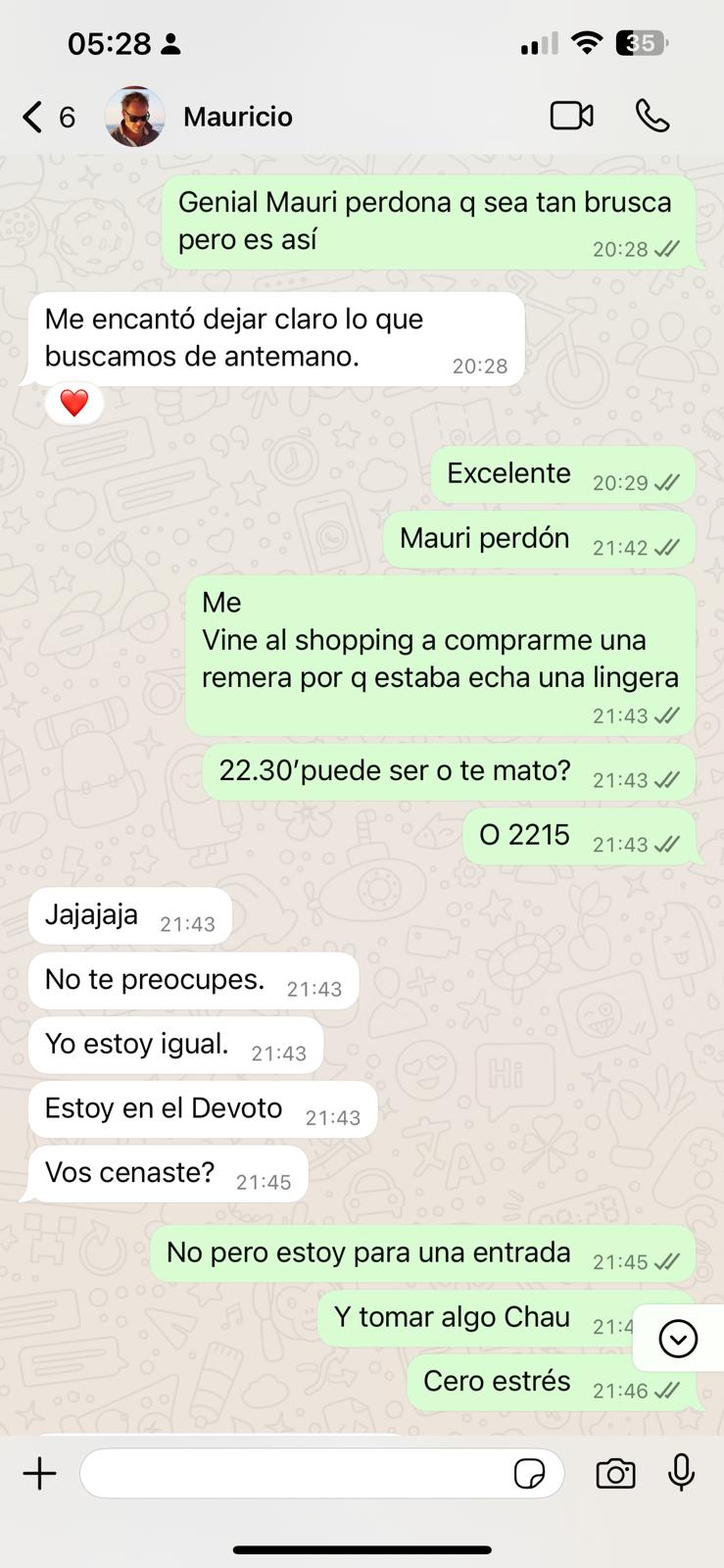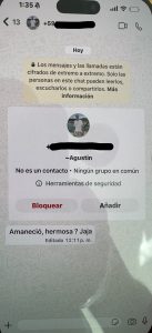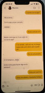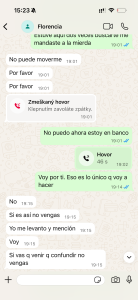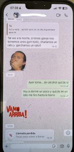 El mes decisivo, o el mes de la última oportunidad, cuando realmente tenía que irme. Aquí sucedieron muchas cosas importantes. Ella fue a su revisión ginecológica periódica y volvió diciendo que los dos teníamos que tomar antibióticos para una enfermedad que probablemente había contraído de su ex. ¿En serio, una excusa tan estúpida? ¿Su ex, con quien no ha estado en más de dos años? Empezó a explicarme una especie de mentira estúpida sobre que podía estar en el cuerpo sin síntomas, pero que ahora se había manifestado, así que, por seguridad, teníamos que tomarlos. Olvidó todos los hombres con que estuvo el tiempo hasta conocer a mí. Qué fácil fue para ella engañarme… Un día me enfermé y tuve que quedarme en cama con 40 grados de fiebre. Florencia aprovechó la situación y me dijo que iba a cenar con su hermana. A mí ni se me habría ocurrido dejar a mi pareja enferma sola en cama con fiebre y salir. Sabía que tenían una mala relación y no quería complicar una posible reconciliación. Durante la noche, me escribió que la cena se alargaría, que estaban hablando mucho porque hacía años que no se veían, que no me enfadara, que quería estar con su hermana. Pero ya se notaba que escribía mal, que estaba borracha. Después de horas, empezó a escribirme mensajes sin sentido y estaba claro que volvía a mentir. Me envió una foto como prueba de que estaba con su hermana, pero era una foto que llevaba dos años en Instagram, lo que confirmaba que toda la noche era mentira. En cuanto se descubre que miente, entra en pánico y o bien ataca agresivamente o bien empieza a escribir como si fuera otra persona: su hermana, su madre, una amiga. Esto se puede ver en las fotos, donde en este caso escribe como su amigo Lucas. Regresó por la mañana y cuando le pregunté dónde había estado y que la foto que había enviado demostraba claramente que estaba mintiendo, empezó a gritar agresivamente. Tuvimos una pelea muy fuerte y cuando por fin se fue a dormir, recibió un mensaje de algún Mauricio. Hice algo que nunca había hecho antes – miré su celular. Hasta ese momento, a pesar de todas las mentiras, creía en el amor, en el vínculo entre dos personas que se supuestamente aman y que nunca podrían hacerse daño de una manera tan horrible y mezquina como la que vi en ese teléfono. Después de todo eso, no podía imaginar que ella, que siempre se jactaba de ser una mujer con valores, con solo dos hombres en su vida, que siempre lo confirmaba llorando, pudiera serme infiel a pesar de sus problemas con el alcohol. Todo el tiempo me pareció extraño que estuviera tan obsesionada con mi teléfono, que tuviera que revisar constantemente todos mis mensajes, lo que tenía en celular, etc. ¡Aquí lo entendí! Porque ella tenía el culo sucio, y bastante. Me di cuenta de por qué tenía esa obsesión, porque las personas que mienten y traicionan a sus parejas piensan que sus parejas hacen lo mismo y por eso sospechan de ellas. Juzgan a los demás según ellos mismos, y eso es un gran error. Y por si fuera poco, les escribía a sus «amigos» diciéndoles que seguía pensando en su ex, que no podía olvidarlo y que probablemente nunca lo superaría.