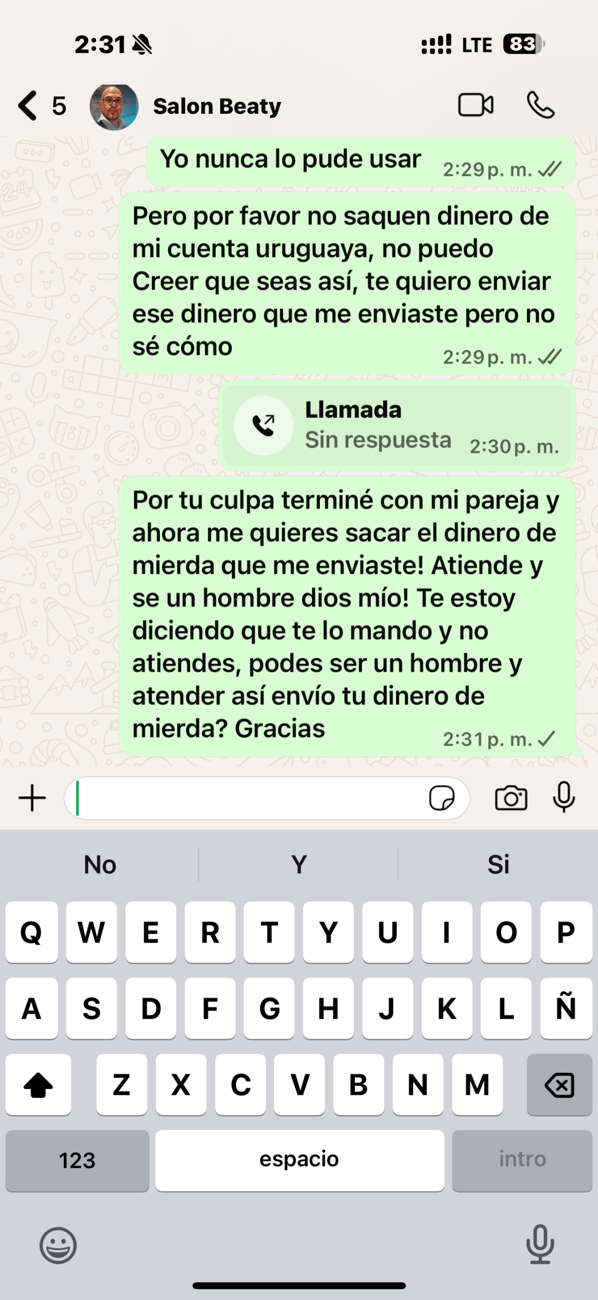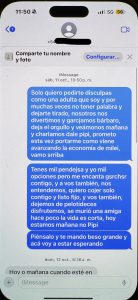 Ahora que lo escribo, me siento como un completo gil, pero la verdad es que tan enamorado, ciego, la adoré hasta que todos mis sentimientos usó contra mí y yo hice lo que ella quiso. Sentí una enorme pena y tristeza después de todo eso y no quería que volviera a terminar en lo que me había contado. Quería ayudarla, pero le puse condiciones: dejar el alcohol inmediatamente, borrar a todos los hombres de su teléfono y empezar a comportarse como una mujer en una relación, adulta y correcta. Está claro que al final no cumplió ninguna de ellas. Tenía una deuda de casi 600 000 pesos: préstamos, todas las tarjetas posibles que hay en Uruguay, antel, las cuotas del coche… Muy gracioso. Uno de deudas fue préstamo a su auto y hasta finales de octubre 25, ella afirmaba que se lo pagaba a su último ex, pero la verdad es que se lo pagaba al otro. No entendía por qué tenía la necesidad de mentir sobre eso, sobre una tontería así. En otras mentiras afirmaba que recibía de su ex entre 10 000 y 20 000 dólares al mes para hacer que quiere, con lo que podría haber pagado fácilmente todo el coche en un mes. Que en un momento tuve en banco 900.000 dólares de el, pero el le prohibió comprar propiedad o invertir. Una mentira super grande eso.