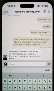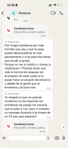 Nos vimos en Madrid, porque tras la última experiencia le dije que, si no iba a terapia, mejor que ni se molestara en venir, ya que no tenía sentido y acabaríamos igual en unos días. Eso fue el domingo. El lunes tenía que empezar la terapia, pero no llegamos a ir. Por la noche, volvió a revisar mi teléfono (entiendo que, después de todo lo que ella hizo y logró en dos semanas en Uruguay, pensara que yo hacía lo mismo, pero no, simplemente me gusta tener una sola pareja estable). En la aplicación Telegram me encontró contactos que, sin embargo, no estaban en el teléfono. Después se dio cuenta de que en su Telegram también había contactos que ella no tenía… volvió a montar una escena de película, me tiró una taza a la cara (por suerte me evité) hasta que llegó la policía. En Madrid hay leyes para las peleas: tres días de cárcel para ambos si hay pelea. Por eso terminamos en un calabozo con negros de la calle, ladrones, traficantes, drogadictos, un desastre. Por eso se perdieron las consultas con el especialista. Es una larga historia. De todos modos, cuando por fin empezó a ir a terapia, sintió que eso podría ayudar. Tuve que regresar a la República Checa y la dejé en el hotel, le pagué la terapia y le dije que volvería en cuatro días. Sin embargo, todo salió mal, tuvimos que cambiar el hotel y no pude tomar el vuelo. Que también en las noches se embarraba no tengo q decir. Una noche le tuve q llamar su prima I. para q se vaya a hotel dormir, q hace otra vez una vergüenza. Mientras tanto, Florencia volvió a buscar en Internet a un sugar daddy que le diera plata. Al principio solo tenía que enviar sus fotos y videos, pero al final él le ofreció 10 000 euros por noche, le envió fotos de su mansión en Valencia, e escribió como no tiene problemas pagar cualquier capricho ella tiene y, por supuesto, Florencia aceptó de inmediato. Vino a decirme que sería un trío. No le creí que dice y que hizo. Nos peleamos, hizo las maletas y se fue al hotel que él le había reservado y pagado mientras tanto. Enseguida llamó a su amiga de Uruguay, que vive en Madrid, y pasó allí la noche con ella rodeada de lujos; al día siguiente debía llegar él. A la mañana siguiente empezó a llamarme para que la ayudara, diciendo que había sido un error, que se había dejado llevar por el dinero, pero que él era raro, que no quería saber nada de él, etc. ¿Qué podía hacer? Fui a buscarla y la traje de vuelta.