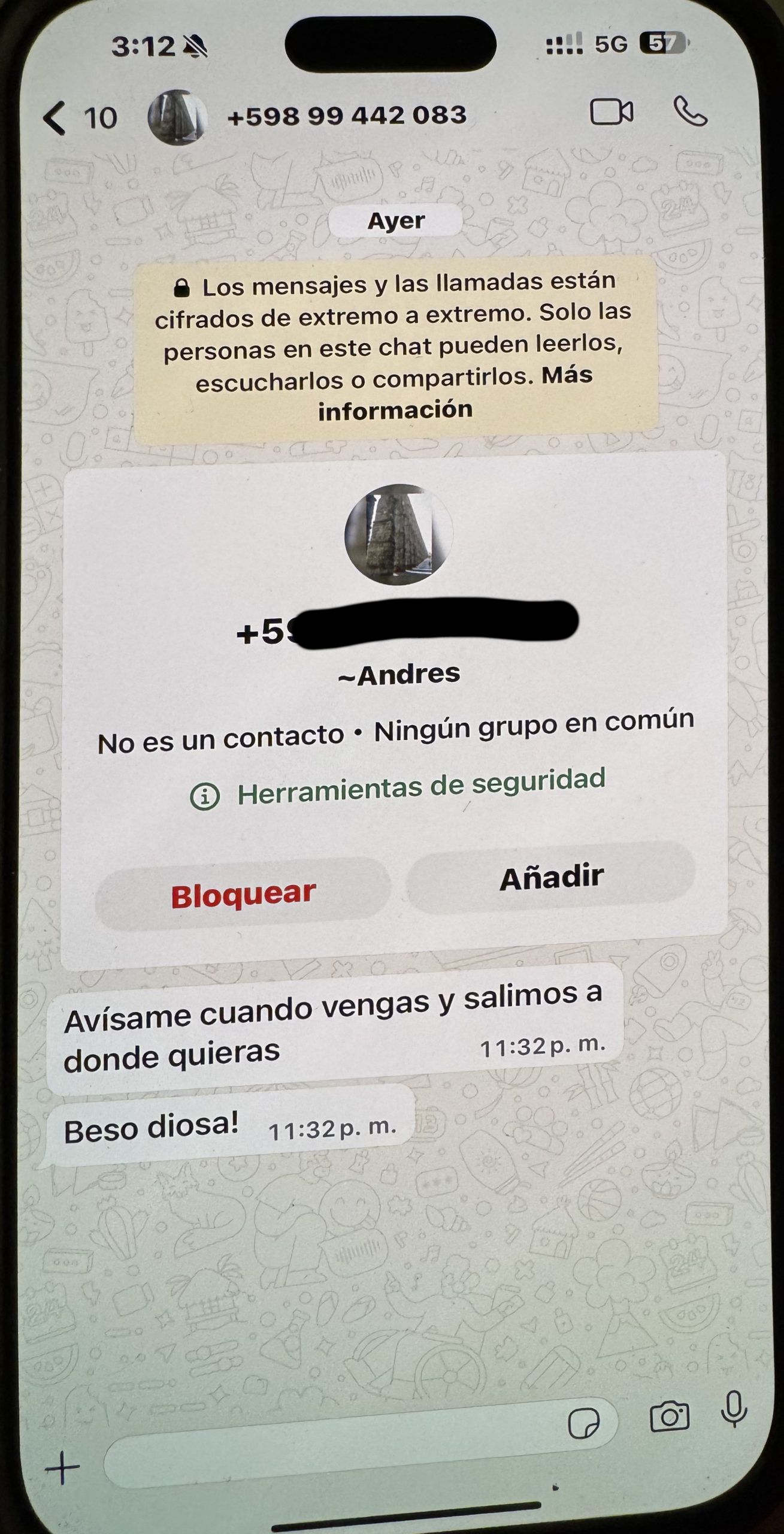 Como ya había pasado antes, al cabo de unos días volvieron las súplicas para que regresara y las promesas de que cambiaría y todo sería diferente; sin embargo, nada funcionó y le dejé claro que ya no creía en sus promesas, que en su caso solo eran palabras vacías, nada más. Un día por la tarde estaba en mi departamento y, de repente, recibí una llamada de un número desconocido: era Florencia. «Estoy afuera, quiero hablar contigo». Pasó algo que ni siquiera podía creer. Llegó haciendo dedo, con un número nuevo, y me dijo: «Toma, aquí tienes mi teléfono; no quiero mi antigua vida, no quiero ni ver a ningún otro tipo, lo he borrado todo, haré todo lo posible para que seas feliz. También te mentí sobre el número de hombres con los que he acostado, fueron más —¡qué sorpresa!—». Fue un gesto increíble de su parte, que me conmovió, y quise comprobar si realmente podía ser verdad y si por fin todo iba a salir bien. Debo decir que, durante un tiempo, sí, no estaba en Instagram, estaba presente en la vida real y nos entendíamos mucho mejor. Pero, por supuesto, eso no duró mucho. Al cabo de un tiempo, volvió a Instagram y las discusiones comenzaron de nuevo, sobre todo por culpa de Instagram, hasta que, durante nuestro viaje a Punta del Diablo y Cabo Polonio, uno de sus amigos volvió a dejar claro lo que realmente quería. El cubano, a quien todos reconocieron junto a su esposa en la fiesta de cumpleaños de Florencia, le envió un mensaje: «¿Te imaginas que tuviéramos sexo?», y le mandó una foto en la que, a propósito, se le veía la pija a través de los pantalones. Por supuesto, eso me enfureció; si a ella le parece normal esto, y la respuesta de Florencia me dejó completamente exhausto. Le escribió «hmmm, el manguera» en lugar de una respuesta contundente, como por ejemplo que tiene pareja o que esto no le parece nada apropiado, nada… Hubo una discusión en la que Florencia volvió a escribirle a su último amante, Tito; Su mamá también le escribió para preguntarle si quería salir con su hija y, según Florencia, también se la había ofrecido a Eduardo. Florencia luego fue a la policía a denunciar a su mamá, diciendo que les escribía a sus amantes para preguntarles si querían estar con ella, que necesitaba plata. No se sabe si al final lo hizo o no, pero estuvo en la comisaría de Punta del Diablo. Una vez más, tuvo que resolver todo por teléfono y tranquilizarla, la tía F.